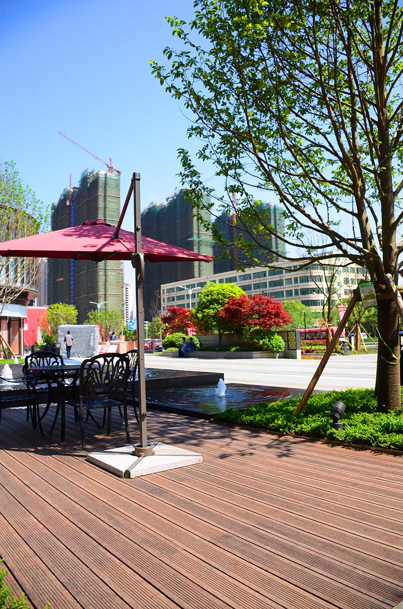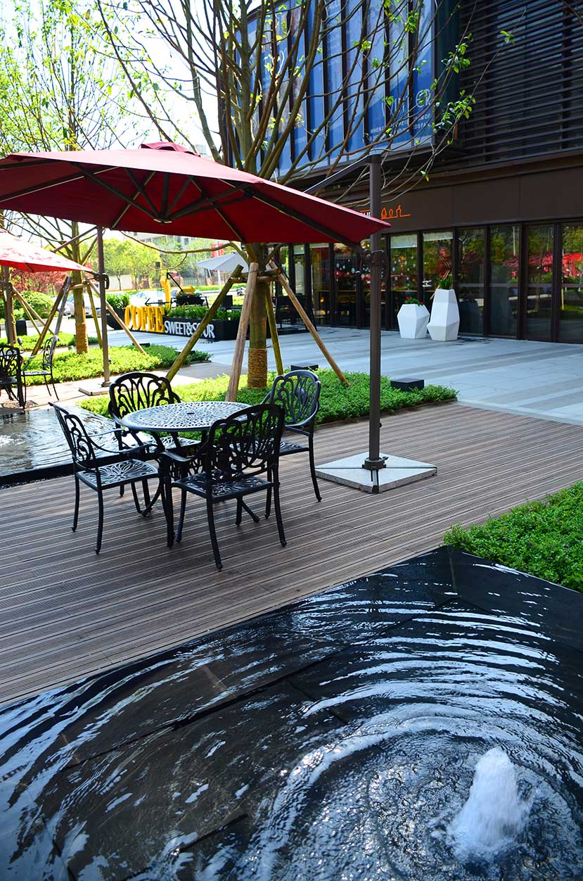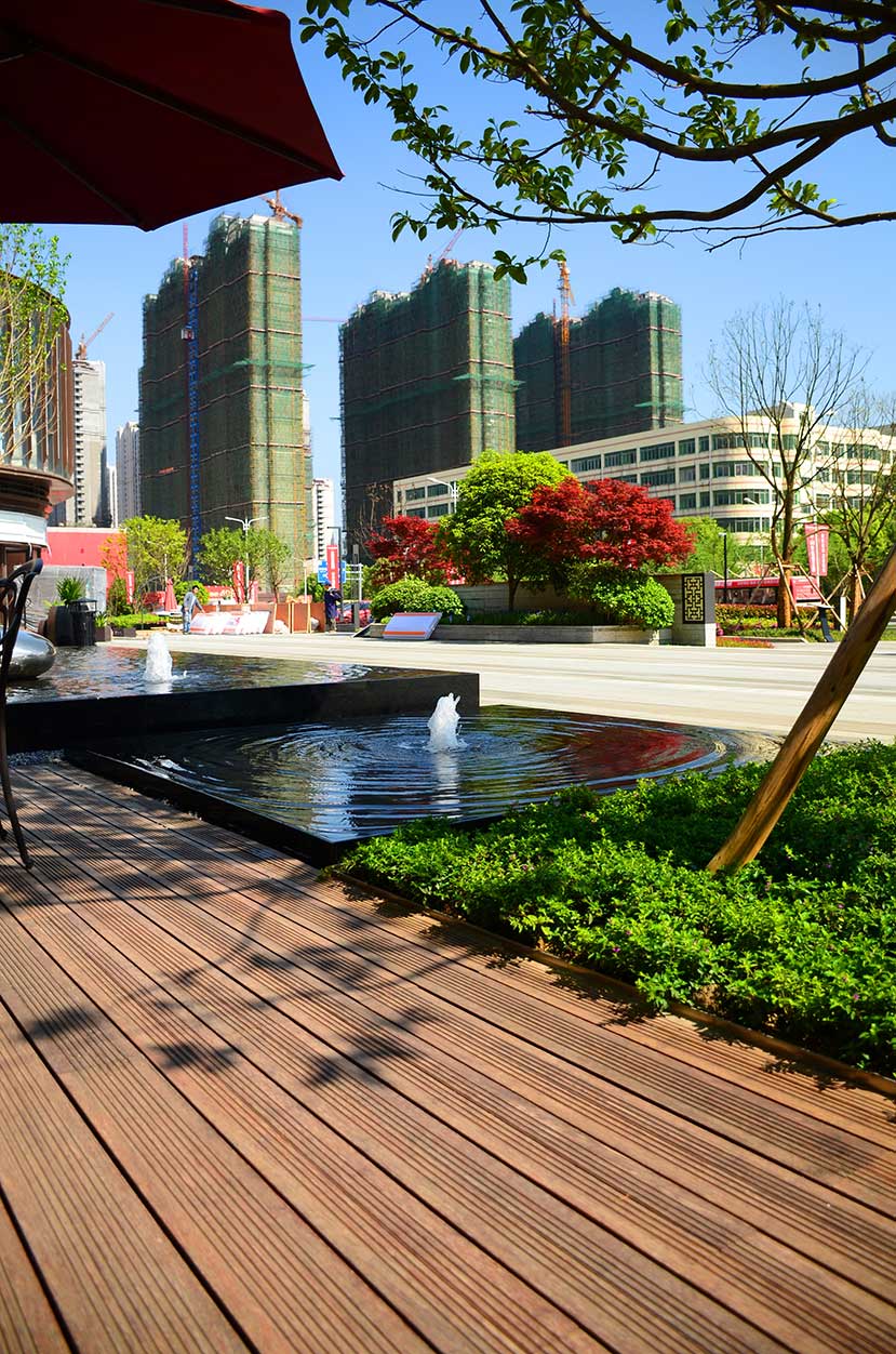 南昌万科金域国际位于南昌经开区双港西大街,是万科地产布局南昌的重点项目,该项目是南昌首屈一指的低密、人文、宜居的学院派主题风格社区。 南昌万科金域国际项目的社区风情广场使用桃花江户外防腐竹地板结合原生石材作为地面铺装,强化人与环境的自然统一,灵动的流水景观与学院派风格的建筑完美结合,漫步其中仿佛置身于欧洲某个宁静的古老小镇。
