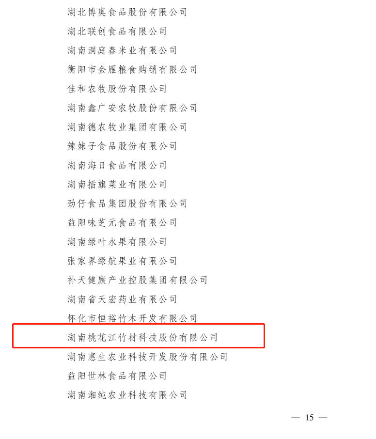 第七批农业产业化国家重点龙头企业认定工作开始于2021年5月,由农业农村部会同国家发展改革委、商务部、中国人民银行、国家税务总局、中国证券监督管理委员会、中华全国供销合作总社组织开展。经各省(区、市)遴选推荐、农业农村部组织专家评审、全国农业产业化联席会议审议、公示,决定,全国412家企业被认定为农业产业化国家重点龙头企业。湖南桃花江竹材的正式获批实现了桃江县“零”国家级龙头企业的突破。