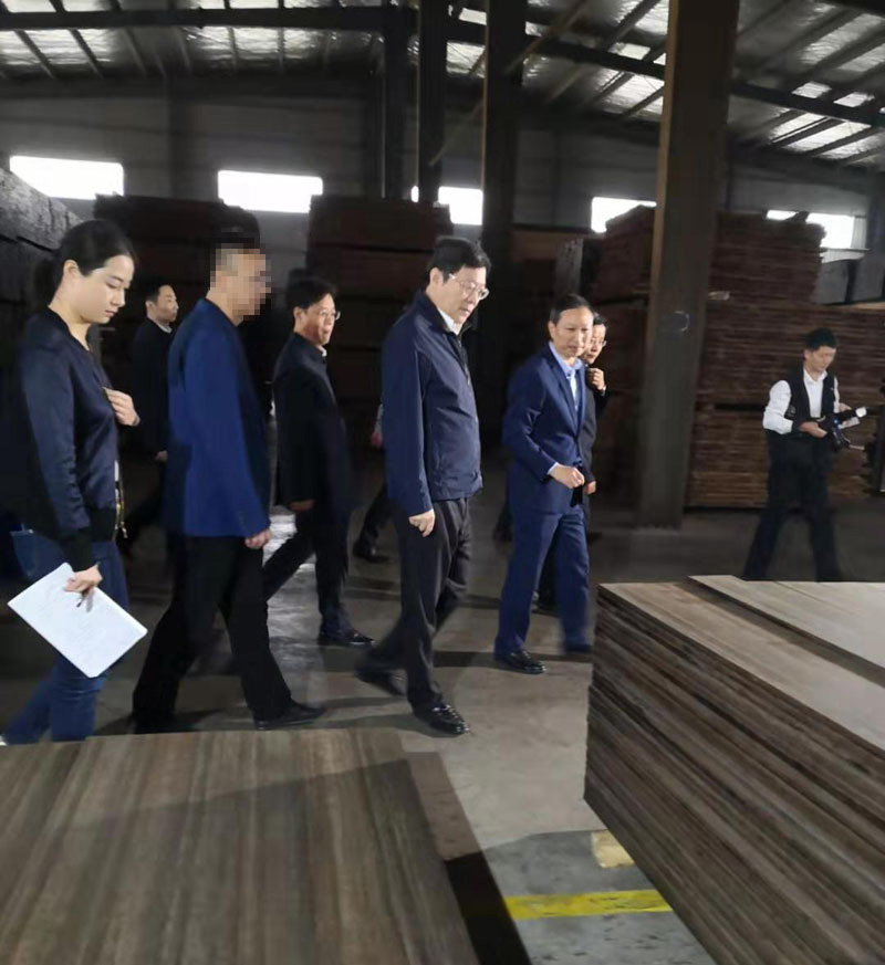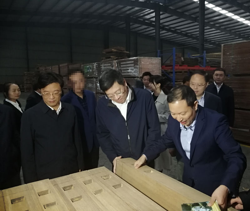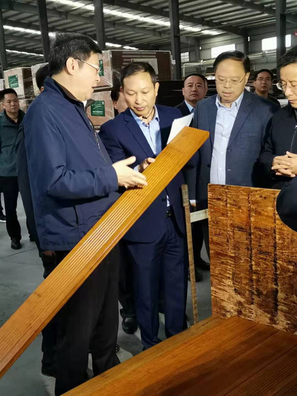 2019年10月15日,湖南省省委书记、省人大常委会主任杜家毫一行莅临我司考察调研,这也是他任职湖南省后第二次造访桃花江竹材。湖南省委常委、湖南省委秘书长张剑飞,益阳市市委书记瞿海、益阳市市长张值恒等相关部门领导陪同调研。在公司董事长薛志成的陪同下,杜书记一行深入我司户外竹材生产车间一线调研,对我司生产经营、人才培养、科技创新和新产品开发等方面进行了调研。杜书记仔细端详公司产品,详细询问产品的生产流程,应用领域和销售情况,他对公司拥有户外防腐竹材、竹地板、竹墙板等10余项国家授权发明专利的研发能力表示赞赏,他说 :"我们需要的就是像桃花江竹材这样的企业 ,有较强的自主研发能力,生产的户外竹材产品,环保又可持续发展,市场前景巨大,发展竹产业又能带动周边竹农致富,政府表示大力支持,前不久出台的那个湖南农业优势特色千亿产业行动方案就部署了对楠竹产业的发展规划,希望桃花江竹材作为竹产业的龙头企业,能充分发挥引领带头作用,提升竹产业的科技创新能力,为把竹产业做大做强贡献更大的力量。"